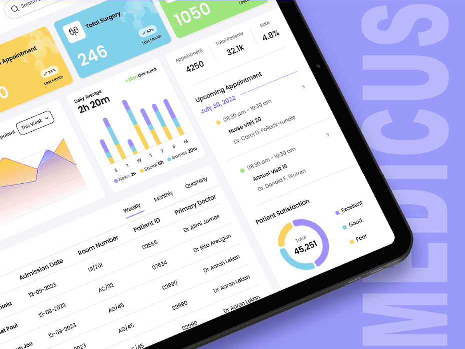The Medicus hospital management dashboard presents a sleek and modern interface designed for efficient healthcare administration. It features a welcoming message at the top, addressing the user as "Hello, John Warker 👋", which adds a personalized touch. The dashboard has a clean, professional layout with a soft purple and white color scheme, providing a visually appealing yet functional experience. At the top right, there are essential controls such as a search bar and buttons labeled "More Like This," "Save," and "Permalink", enhancing usability and accessibility.